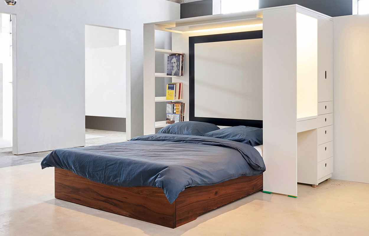 Damit der Familiensegen nicht durch andauernde Aufräumkommandos gestört wird, hält die Koje eine Menge Stauraum bereit, der sich mittels der ausreichenden Schubladen und einer Schrankeinheit auch gut erschliessen läßt. Neben dem Bett, sowie im Bettkasten können somit Nützliches und Überflüssiges eine friedliche und gemeinsame Koexistenz eingehen. Auch wenn Bücher vermehrt digital gelesen werden, einen Platz für die restlichen analogen Exemplare bietet das Regal neben dem Bett. Alle Formate finden hier ihren ausreichenden und würdigen Platz und sind inspirierend nah, in Griffnähe. Ein beleuchteter Schminkspiegel macht die Koje zum Hort der Pflege und des Wohlbefindens.