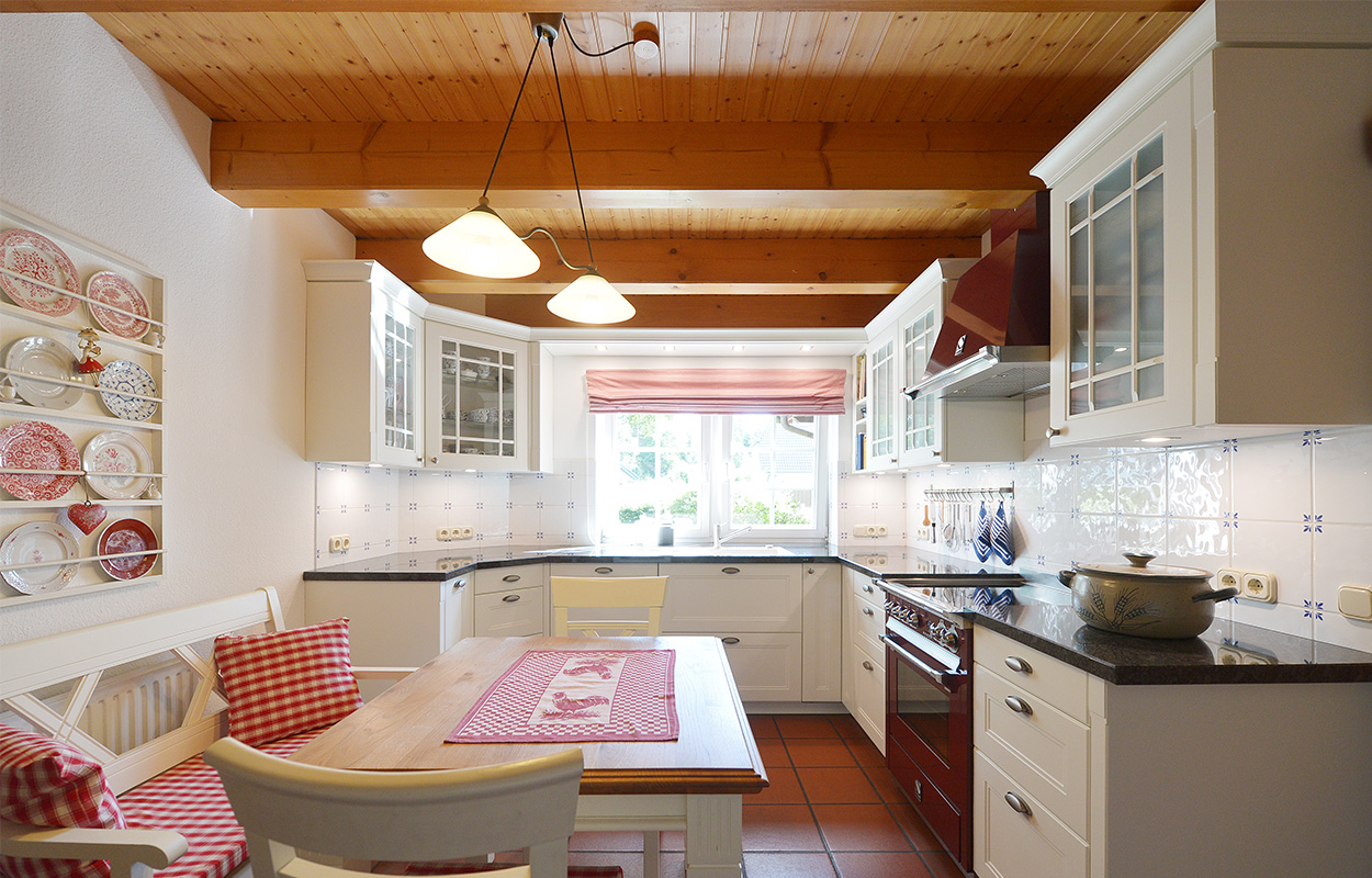 Seien wir doch mal ehrlich: Eine grifflose, weiße Lackküche ist schön, aber ist sie auch gemütlich? Wir waren daher von dieser Küche im Landhausstil besonders angetan, da sie auf ganz eindrucksvolle Weise moderne Funktionalität mit heimeliger Gastlichkeit kombiniert, ohne dabei auch nur im Geringsten angestaubt zu wirken. Im Kontrast zur Naturholzdecke und im Spiel mit den warmen Farben der Türen verleiht sie dem Raum jetzt Eleganz und Weite und harmoniert mit ihrem supermatten Lackaufbau sowie den Kassetten-Fronten mit den matten Tönen beider Hölzer. Klassische Elemente wie die abschließenden Pilaster bei Unter- und Oberschränken oder eine umlaufende Kranzleiste unterstreichen zwar den Charakter des typischen Landhausstils, nehmen dieser Küche aber nicht die Wirkung und Kraft, eine charmante Interpretation eines uralten Gefühls zu sein : Heimat.