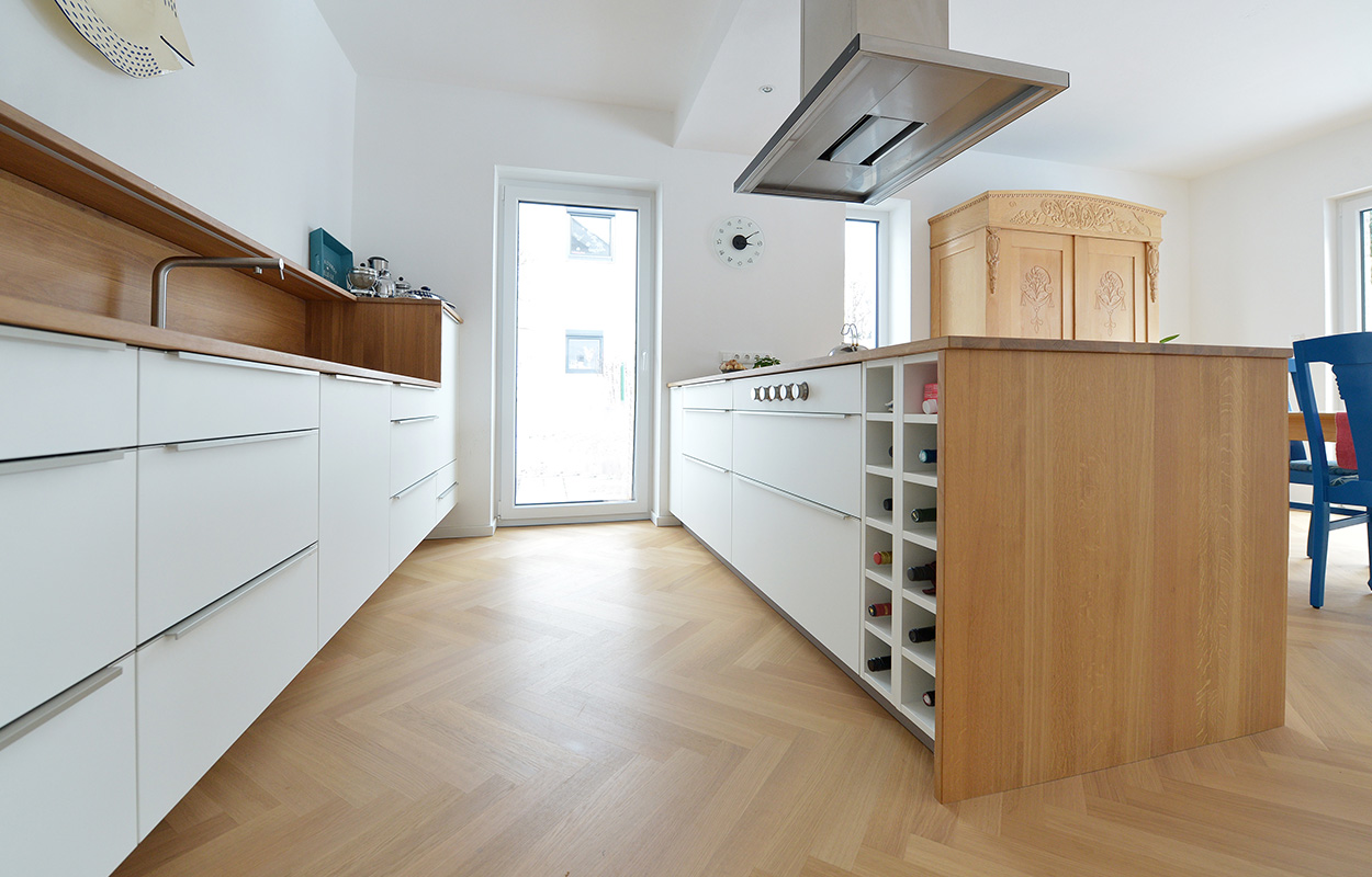 Dezent ist es aber auch, so finden wir, wenn die gesamte Küchenzeile zehn Zentimeter über dem Boden schwebt. Sockel? Haben wir uns einfach gespart. Noch nie sah Eiche so leicht aus und selten lässt sich ein Küchenboden so schnell und krümmelfrei wiederherstellen. Individuelle Lösungen wie ein kleines Weinregal oder ausreichend Platz für die Sammlung irdener Töpfe und Schalen machen die Zusammenarbeit mit uns so effizient. Wir hören zu, setzen um und machen zufrieden. Irgendwie wie kochen.
