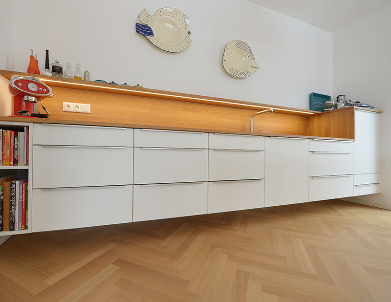 Ein bisschen Schweben muss schon sein. Und ein bisschen verstecken natürlich auch. Diese Küche kann beides.