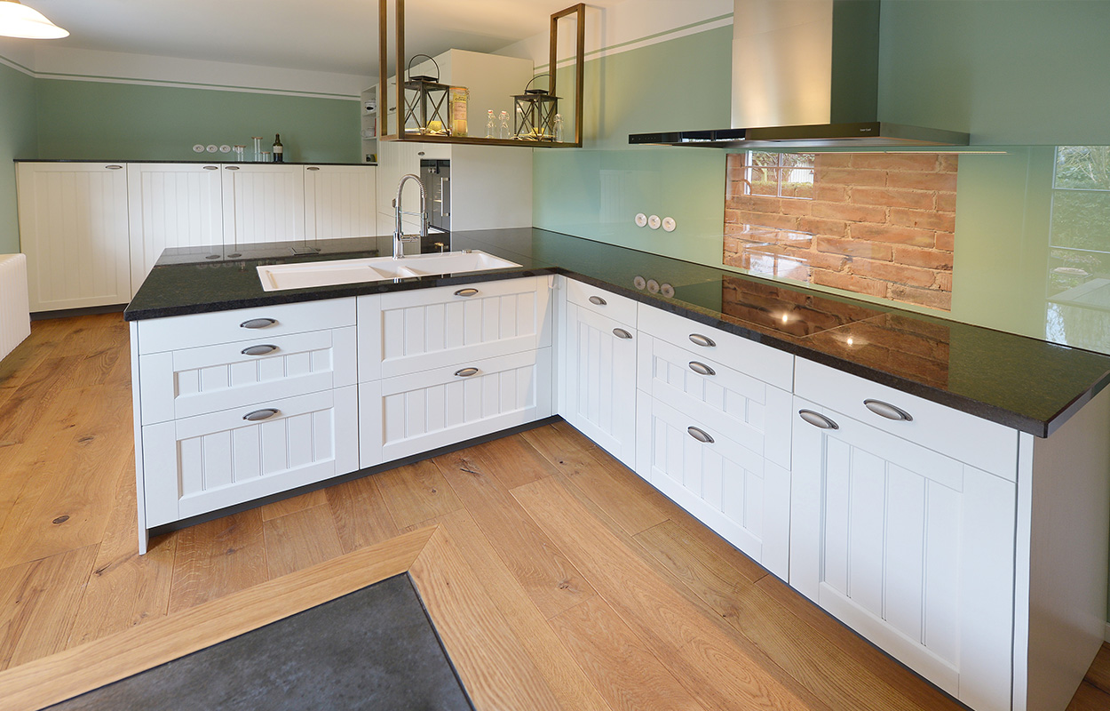 Also, Fußböden raus, Wände gestrichen, Elektrik neu - die Voraussetzungen für das makeover könnten nicht besser sein. Und da weiß noch immer die Farbe der Wahl in Deutschland ist, wird diese Küche auch lange aktuell bleiben. Getoppt wird der ausreichend vorhandene Stauraum mit extra Vorratsraum von der Arbeitsplatte aus Granit in „cSuede /offee brown“. Der robuste, glänzende Granit flankiert die mintgrünen Wände und den Fußboden aus Eiche. So entsteht ein echter Wohlfühlraum, der Küchenarbeit in entspannte Freizeit verwandelt.