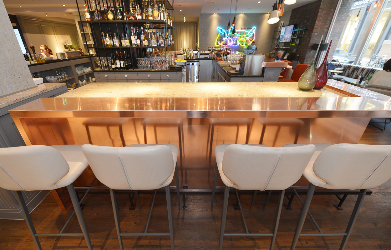 Das Besondere an diesem Auftrag war, dass das Hotel ein komplett neues Gesicht bekommen sollte. Und dieses Gesicht musste sich in die bestehende Struktur integrieren. Der entwickelte Industrielook, der auf die ehemalige Druckerei anspielt, die einst hier druckte, wurde mittels schwarzem Stahl, coolen Accessoires und von uns gefertigten Möbeln und besonderen WCs akzentuiert.